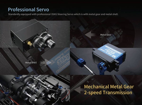 Configuration de la fonction d'escalade Essieu du portail : Inclus Rapport de transmission : Servocommande métal à 2 vitesses, contrôlée à distance Différentiel : Différentiel avant/arrière Verrouillage du différentiel : Verrouillage différentiel avant/arrière, interrupteur servocommande contrôlé à distance Transmission inversée : Inclus Méthode de fixation de la carrosserie : Vis manuelles + fermeture magnétique à basculement avant Mécanisme de liaison : 4 liaisons + liaison de Watt arrière Position du servomoteur : Sur l'essieu